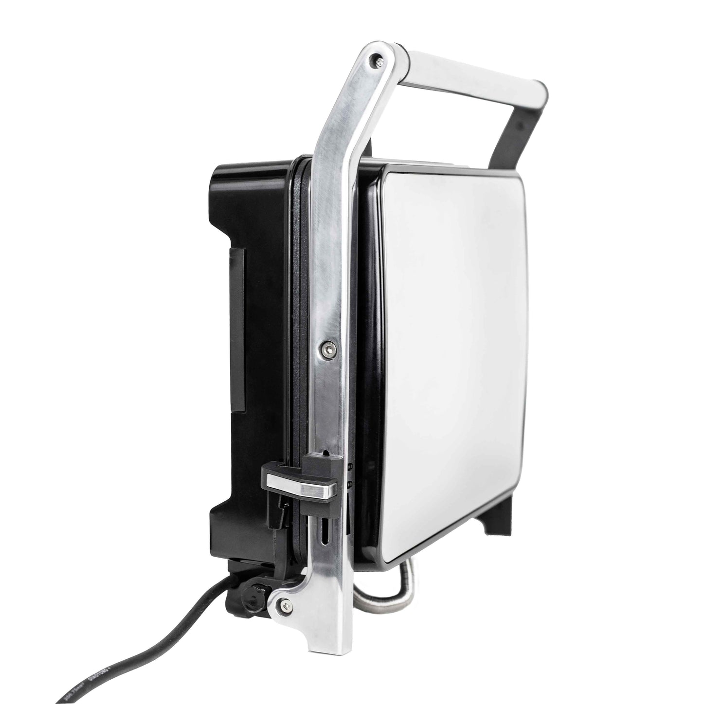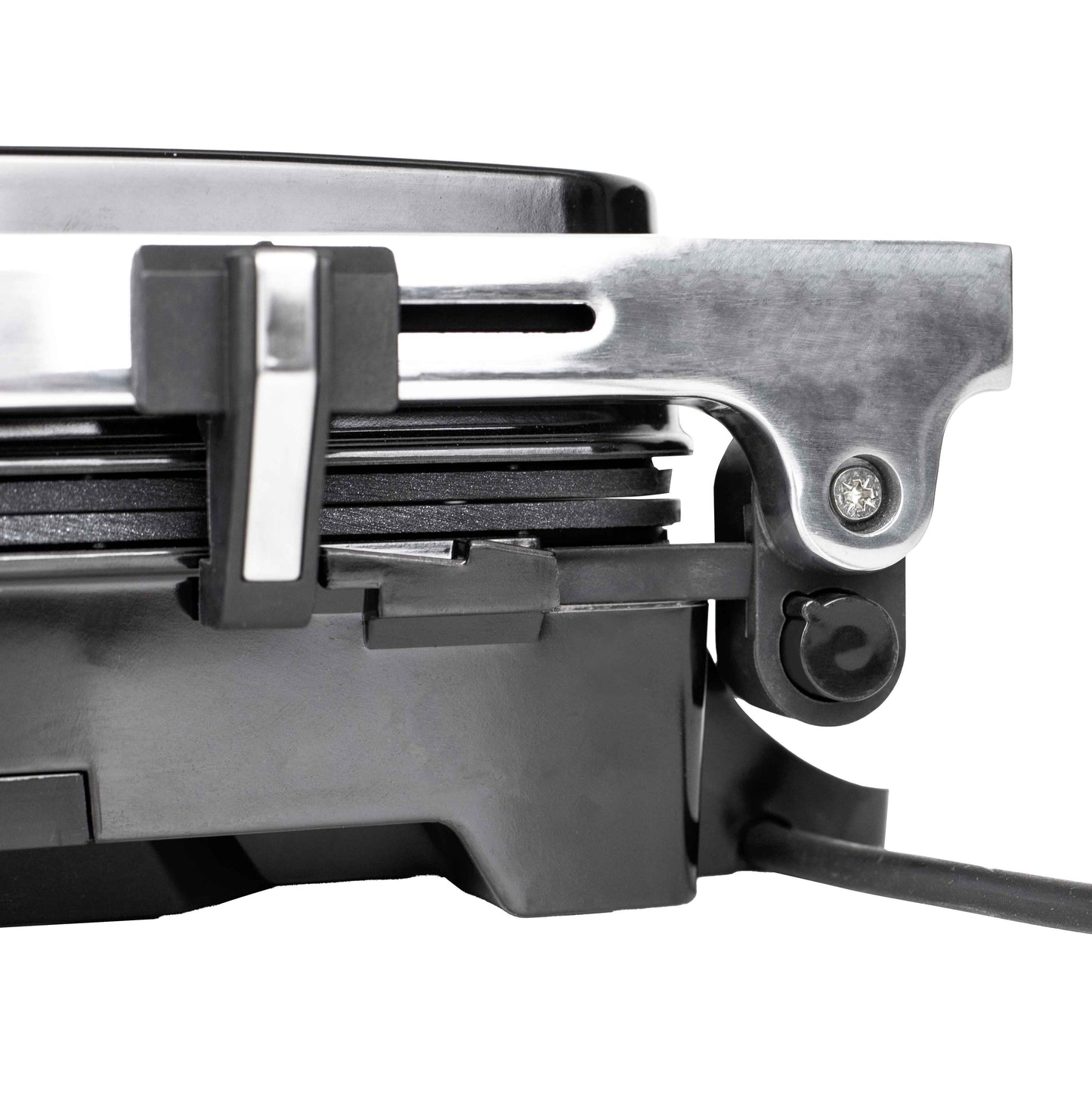 - La leva laterale serve per fissare l'altezza delle piastre nella posizione adeguata al tipo di cottura oppure per chiudere le piastre per riporre la bistecchiera in verticale