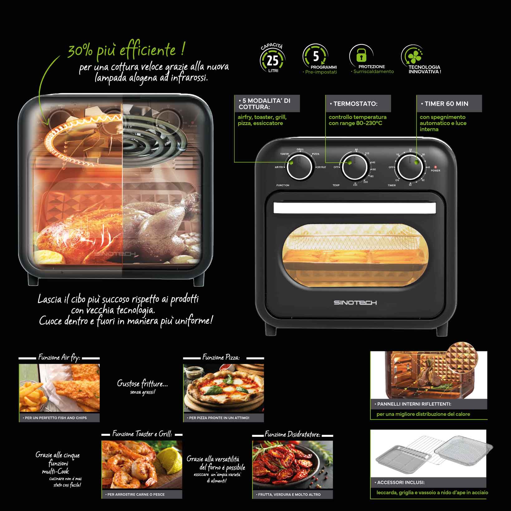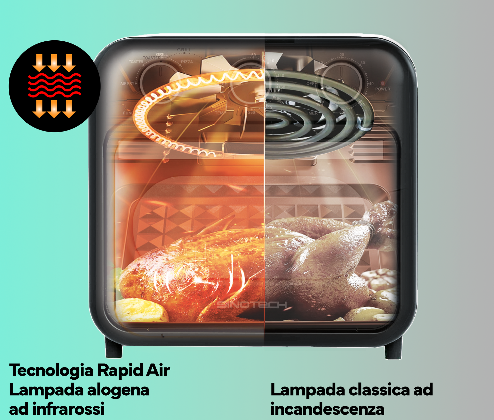 - Tecnologia innovativa con lampada alogena ad infrarossi per una cottura più uniforme, succosa all'interno e croccante fuori.