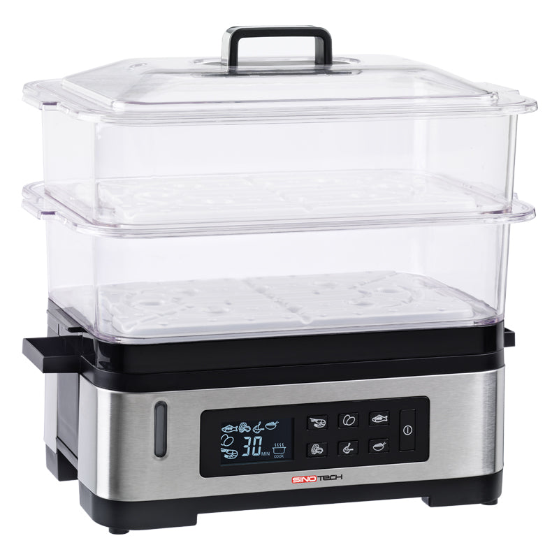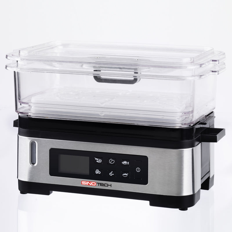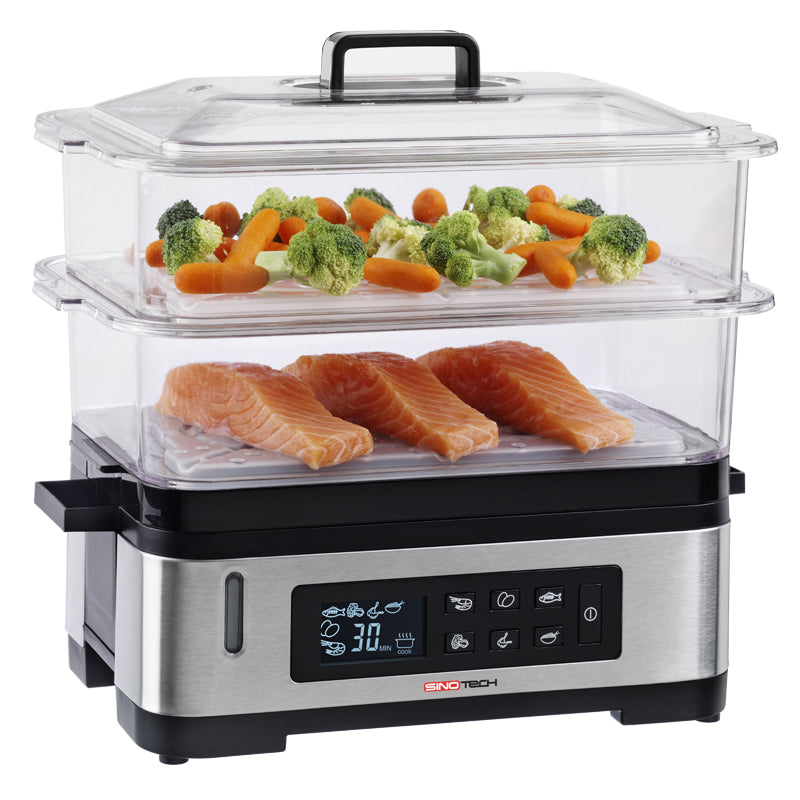 La vaporiera digitale Sinotech è un valido aiuto nella tua cucina! La cottura a vapore è ideale per una cucina senza grassi e per mantenere inalterati i sapori di carne, pesce, verdure, uova e riso. Facile da utilizzare grazie ai 6 programmi pre-impostati, basterà premere il tasto corrispondente e aspettare che la vaporiera finisca. I due capienti cestelli trasparenti sono in materiale BPA FREE per la salvaguardia della nostra salute. Il display LCD mostra il cibo selezionato ed il tempo con il countdown automatico per sapere sempre quanto manca alla fine della cottura. La vaporiera digitale Sinotech ha una comoda funzione di mantenimento del calore al termine del programma. In caso di esuarimento dell'acqua la vaporiera si spegne automaticamente. I cestelli impilabili offono il minimo ingombro quando riponi la vaporiera.